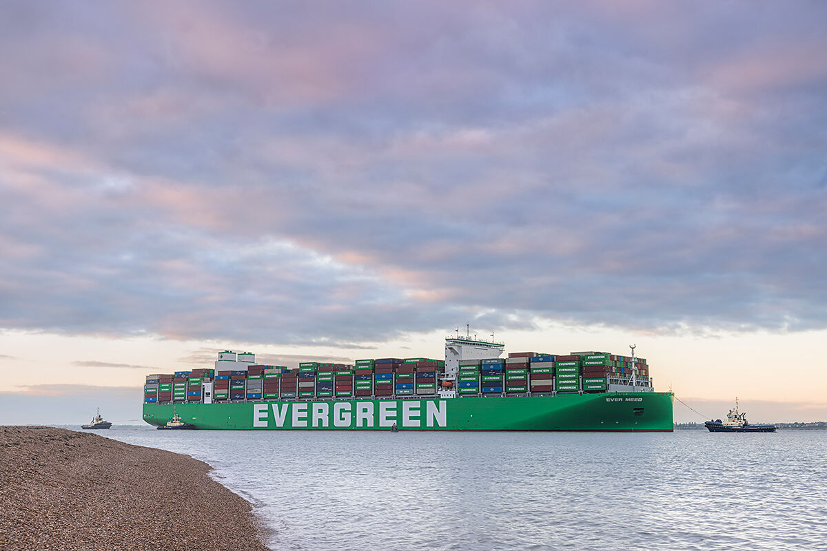 A container ship approaching the Port of Felixstowe, Suffolk, England